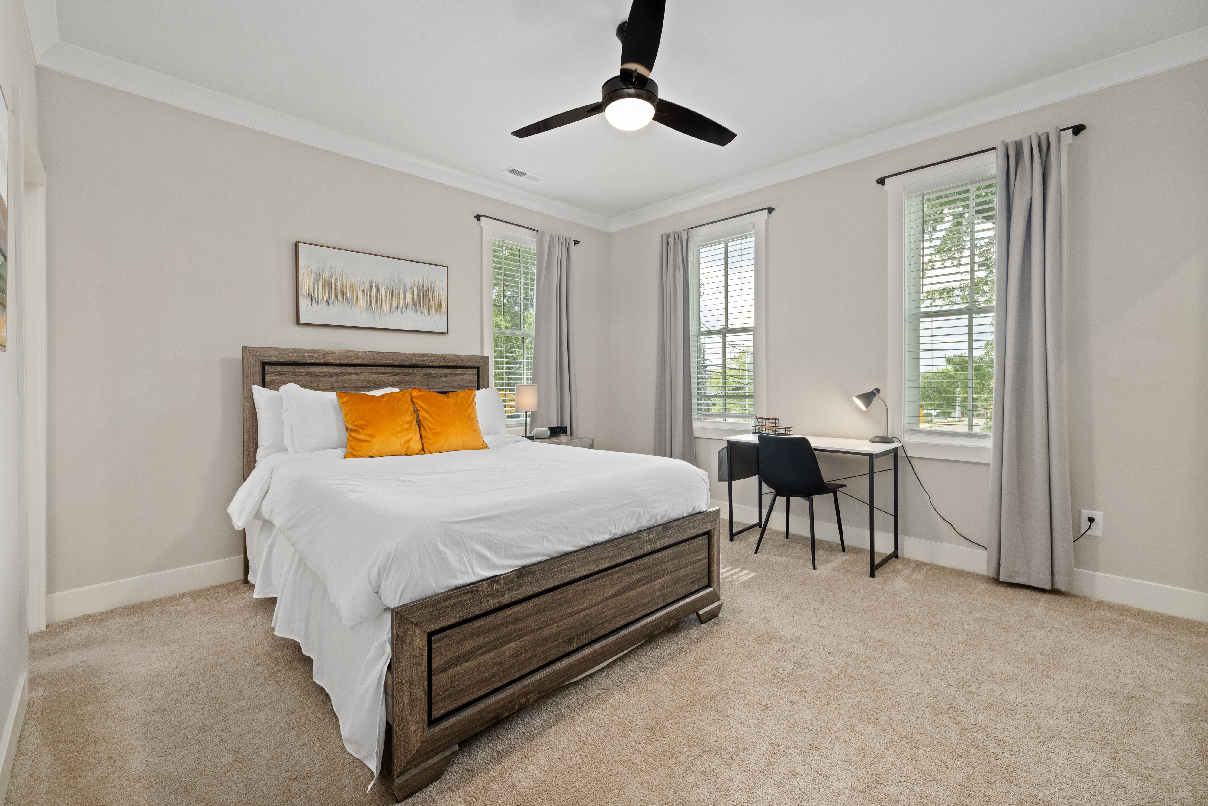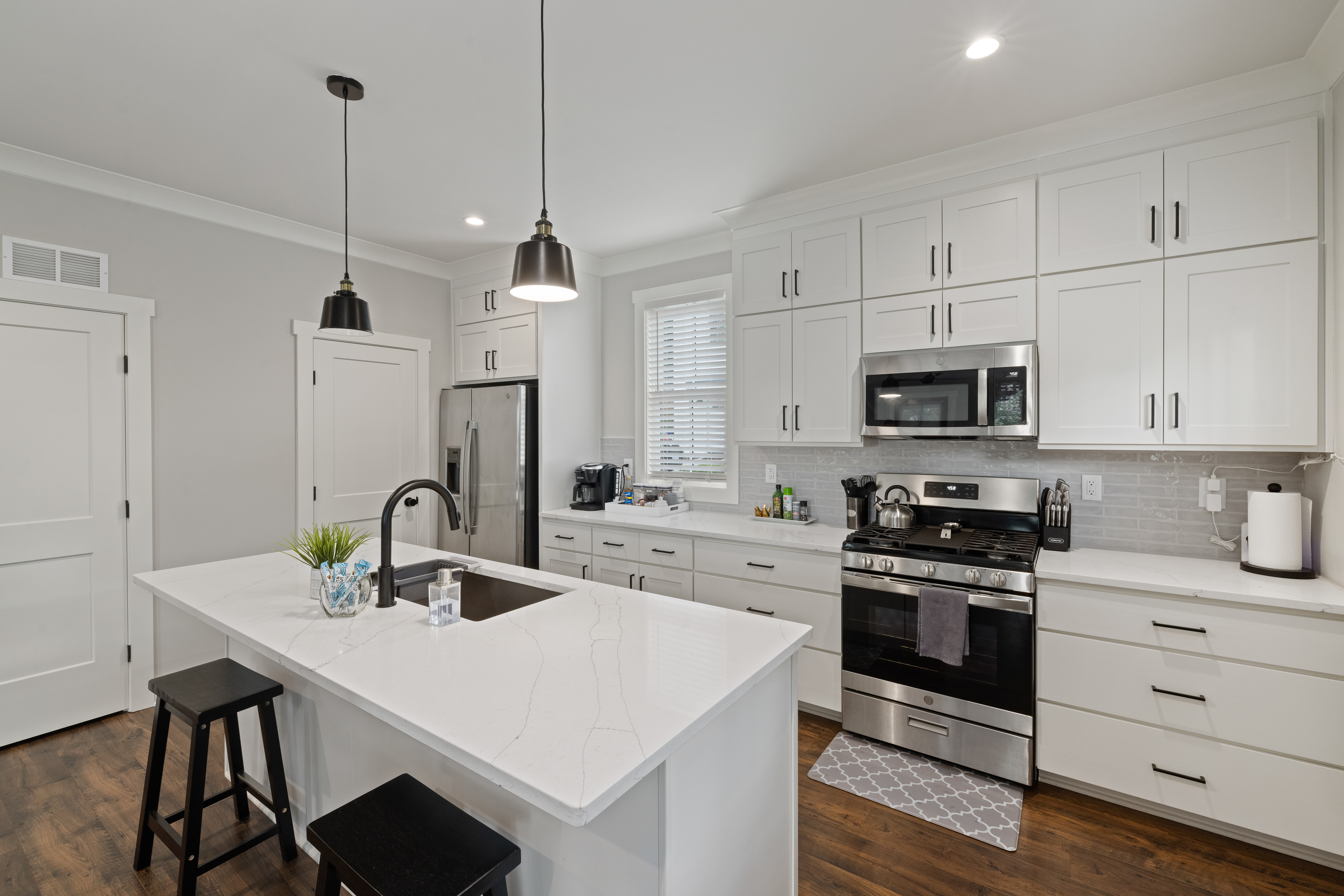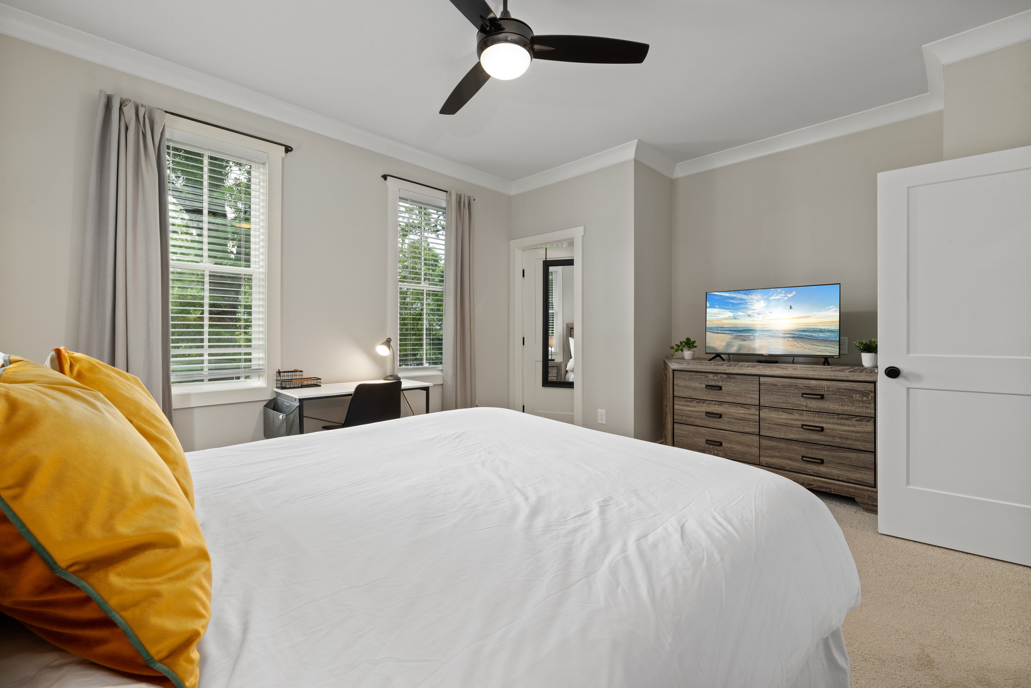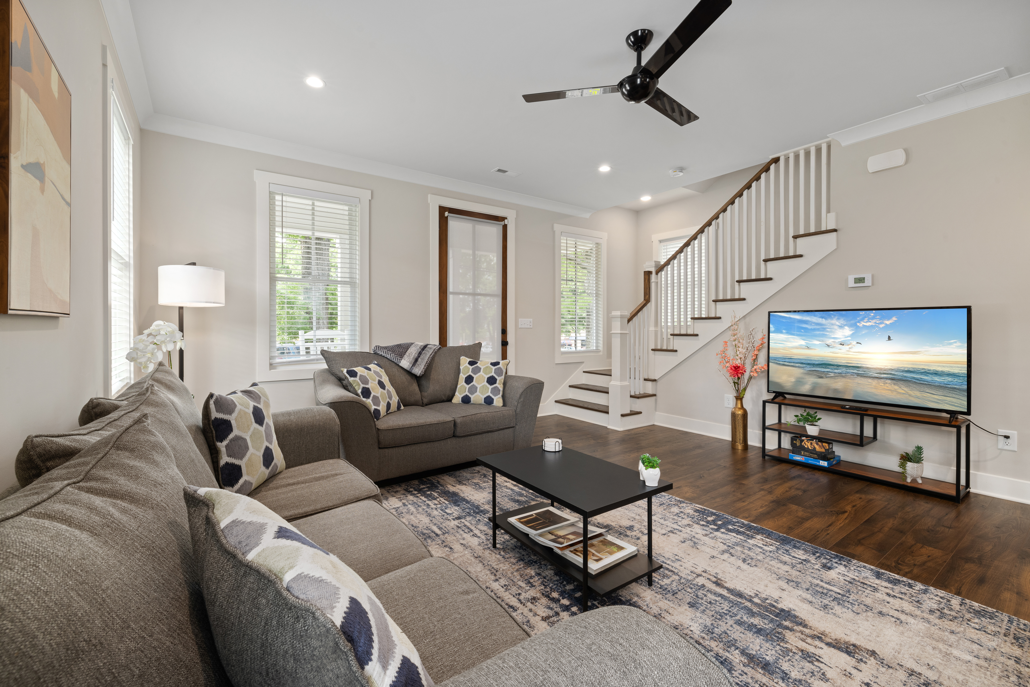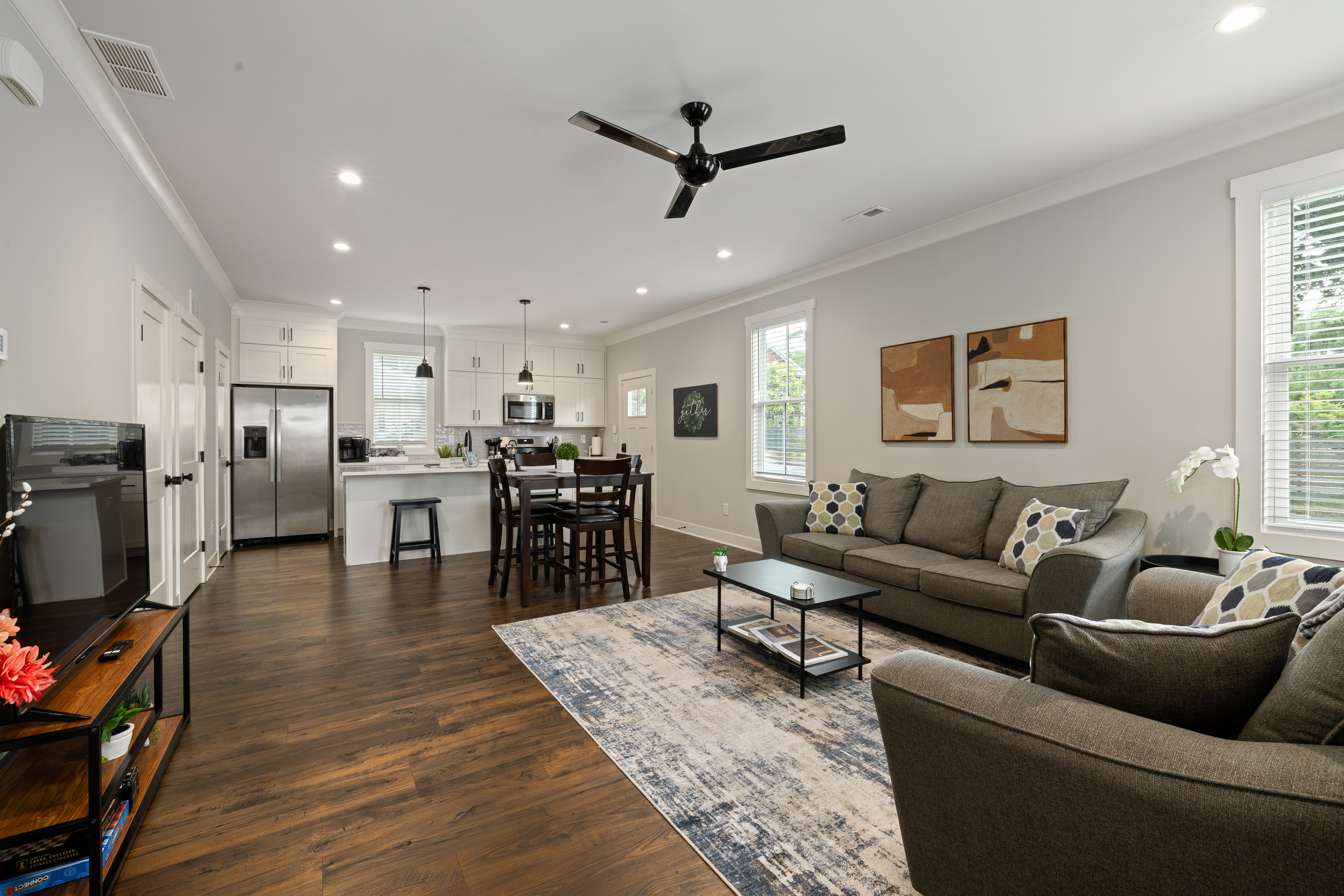 Welcome to our modern, blue, newly built 2BR home in Trinity Park — designed for comfort, convenience, and a true home away from home. Perfect for hospital visits, parents of students, faculty stays, or exploring Durham, we’re just minutes from Duke University, Duke Hospital, Ninth Street dining, Whole Foods, and downtown. Inside you’ll find: • Two ensuite bedrooms with blackout curtains, plush bedding, walk-in closets, desks, TVs, ceiling fans, and white noise machines • Bright open living area connected to a fully equipped kitchen with quartz countertops, stainless appliances, and a powder room for guests • Thoughtful touches like plush towels, stocked coffee options (drip + Keurig), and games for downtime • Washer/dryer for longer stays, plus two dedicated driveway parking spots with a Level 2 EV charger The house is on a main street, so some road noise is possible, but most guests find it comfortable thanks to blackout curtains and white noise machines. We’ve designed this space for both short and medium-term stays, blending the polish of a new build with the warmth and details of a lived-in home. Guests often call it their “home away from home.”
