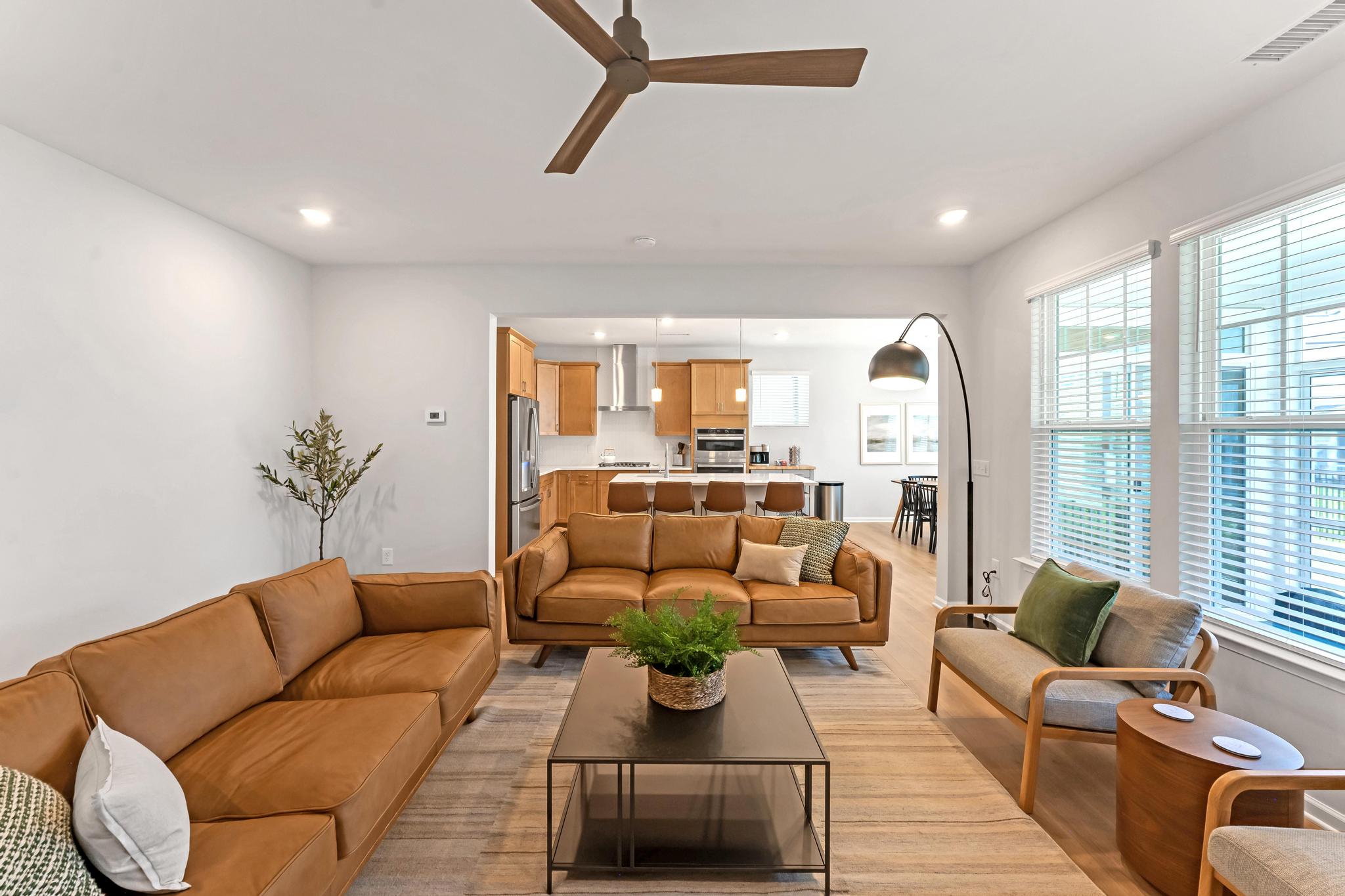 Brand-new 3-story single-family home (approx. 2,750 sq ft) in the sought-after North Ridge / North Raleigh area, located on a quiet cul-de-sac. The home is designed specifically for comfortable mid-term stays (relocations, corporate housing, extended family visits) with generous space, high-end finishes, and a “live like home” setup. Layout & sleeping • 5 bedrooms (including a private office/guest room with a door + closet + sleeper sofa) • 4 full bathrooms • Spacious layout across three levels, giving families and groups room to spread out and maintain privacy. Kitchen & dining (fully equipped for real cooking) • Gourmet chef’s kitchen with a large island and stools for casual meals • Quartz countertops and beautiful maple wood cabinetry with ample storage • High-end GE Profile stainless appliances, including: • Refrigerator with filtered water + ice dispenser • Dishwasher with Wi-Fi connectivity • Oven + microwave with probe cooking • Gas stove for precise temperature control • Fully amenitized kitchen with quality cookware and bakeware for everything from quick meals to full dinners • High-quality dishware, glassware, and flatware (Williams Sonoma) Comfort & furnishings • Brand new furniture from quality brands (Article, West Elm, Pottery Barn) • Premium Helix mattresses for comfortable sleep • High-quality bedding and towels • Warm finishes with artwork and rugs throughout Living spaces & outdoor enjoyment • Large family room connected to the kitchen for easy gathering and entertaining • Indoor fireplace for a cozy atmosphere • Screened porch for relaxing outdoors while staying protected from the elements Bathrooms • Primary bathroom includes a soaking tub and a deluxe walk-in shower • All bathrooms have handheld shower heads • Hair dryer in every bathroom • Complimentary toiletries provided (shampoo, conditioner, body wash, soap) Work-ready & fast internet • Dedicated workspace with an adjustable-height desk and ergonomic chair • 1 GB high-speed internet with routers on each floor for strong coverage throughout the home Practical amenities • In-home washer and dryer • Two-car garage with guest access + convenient parking • Plenty of storage to keep longer stays organized and clutter-free • Electronic door locks for easy self check-in • State-of-the-art alarm system (exterior security cameras disclosed separately in the safety section)